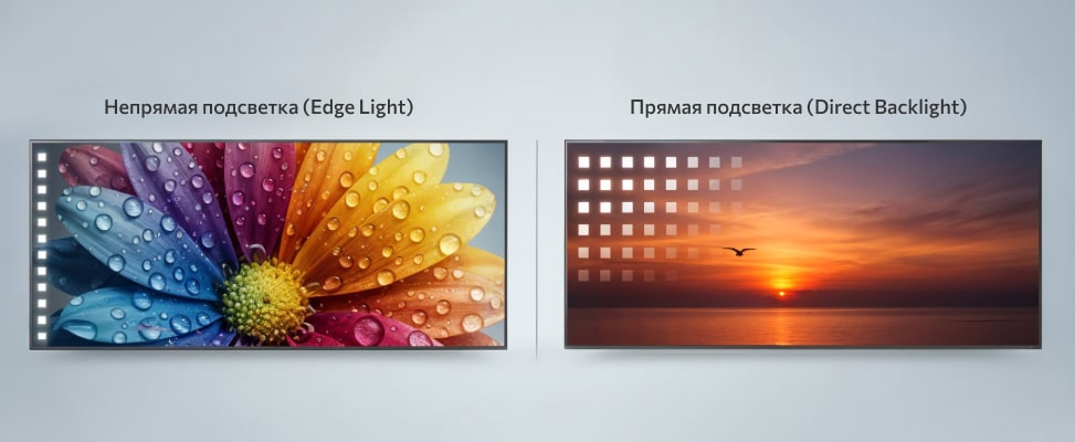 - Direct LED — светодиоды находятся за всей площадью экрана, обеспечивая более равномерную подсветку.