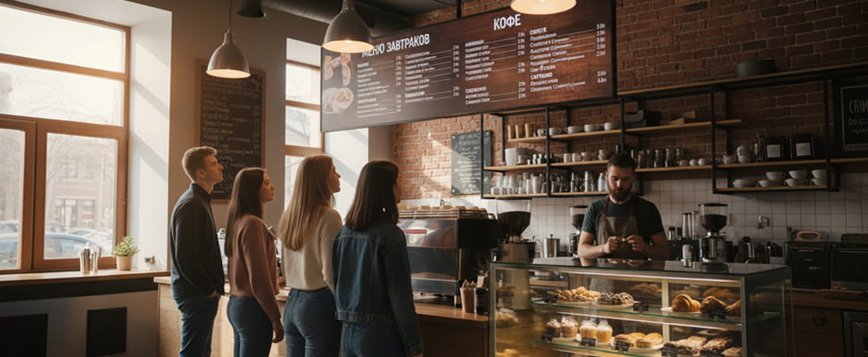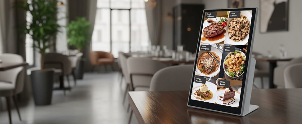 Ещё один популярный сценарий – продвижение акций и спецпредложений. На экране можно показывать «блюдо дня», скидку в определённые часы, бонус за повторный заказ или предложение к основному блюду, например напиток или десерт. Такой контент особенно хорошо работает в обеденное и вечернее время, когда поток гостей высокий, а персоналу сложно уделить внимание каждому столику.