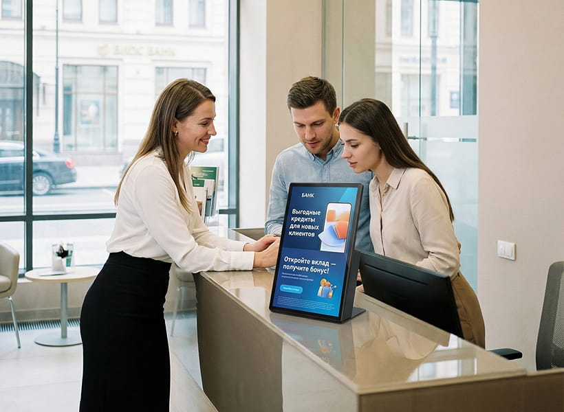 Сенсорные экраны позволяют клиентам находить интересующую их информацию и просматривать видео/баннеры, которые несколько раз привлекали их внимание.Онлайн-студия
