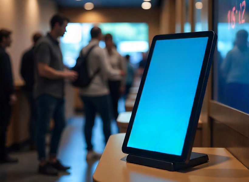 Цифровой тейбл-тент – современное компактное мультимедийное устройство для размещения на столе, стойке или кассе банка.